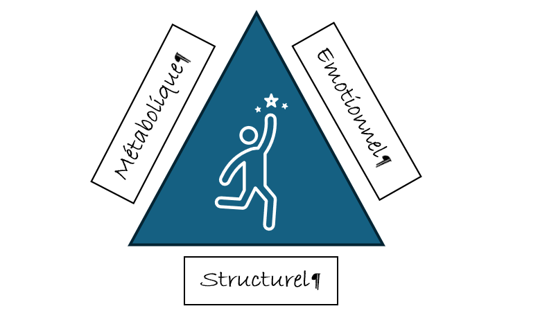 - Le triangle de la santé composé de ses trois piliers qui peuvent à la fois se déséquilibrer les uns les autres si une problématique personnelle subsiste sur le long terme, mais également se rééquilibrer par une ou plusieurs séances en ne travaillant que sur l’un des trois.